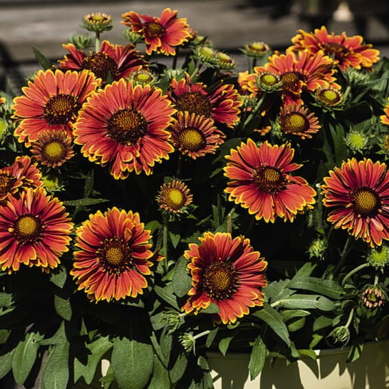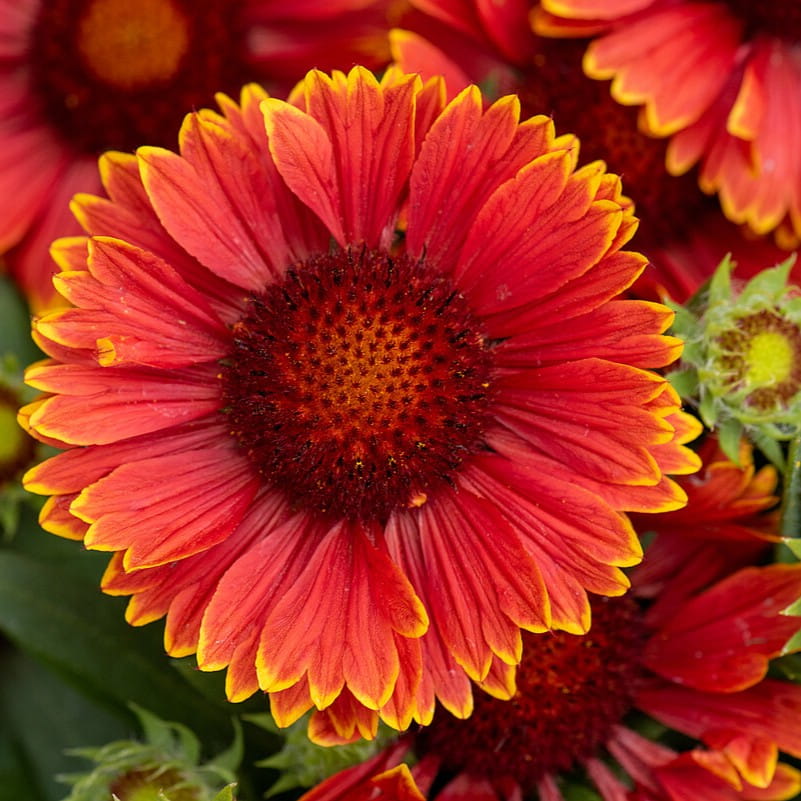 Gaillardia aristata ‘SpinTop™ Yellow Touch’ to kompaktowa odmiana gailardii o mocnym, ognistym efekcie: głęboko czerwone płatki są wyraźnie “muśnięte” żółcią na końcach, co daje intensywny, dwubarwny kontrast. Roślina tworzy niską, równą kępę — około 30 cm wysokości, a w czasie kwitnienia około 35 cm, dzięki czemu świetnie pasuje na przód rabat oraz do donic.