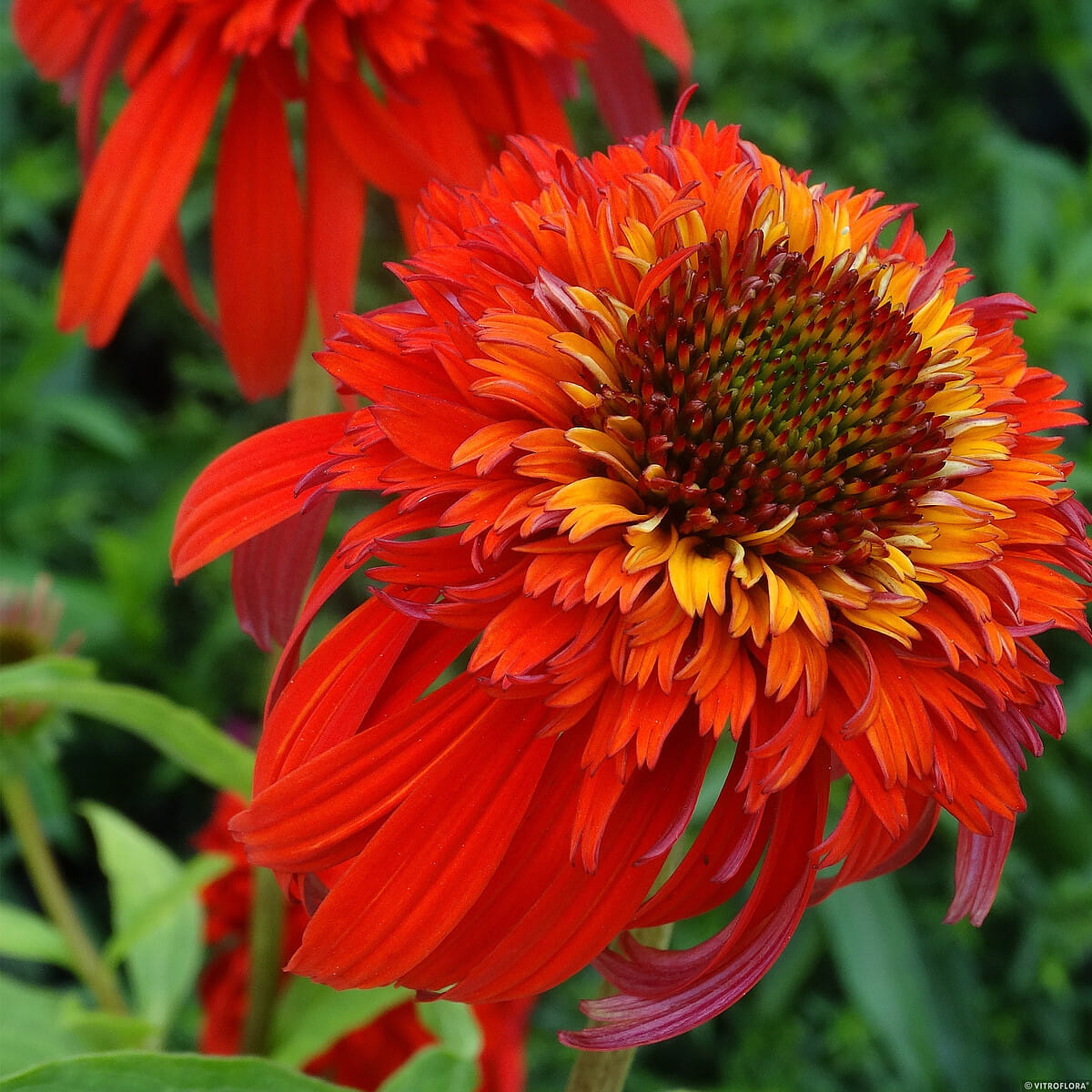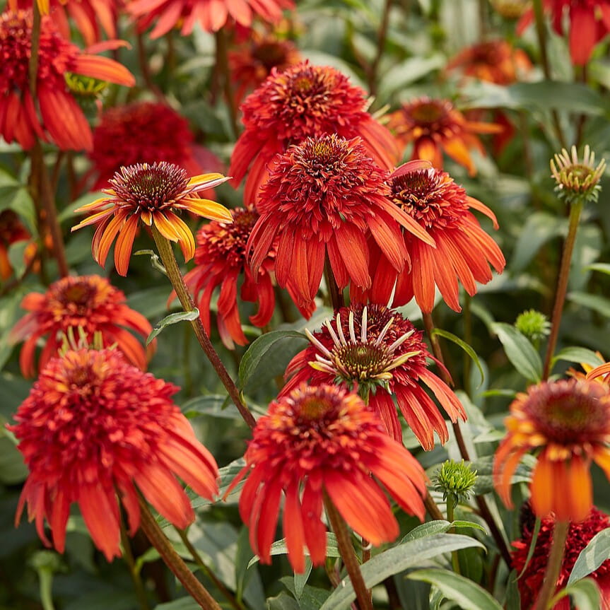 Echinacea hybrida ‘Hot Papaya’ to efektowna odmiana jeżówki hybrydowej, ceniona za pełne, intensywnie pomarańczowo-czerwone kwiaty o dużej dekoracyjności, które tworzą gęste “pomponowe” koszyczki z jaśniejszym środkiem. Jej kwiaty stanowią silny akcent kolorystyczny na rabatach, dobrze widoczny nawet z daleka, a ich intensywny odcień utrzymuje się przez cały okres kwitnienia.