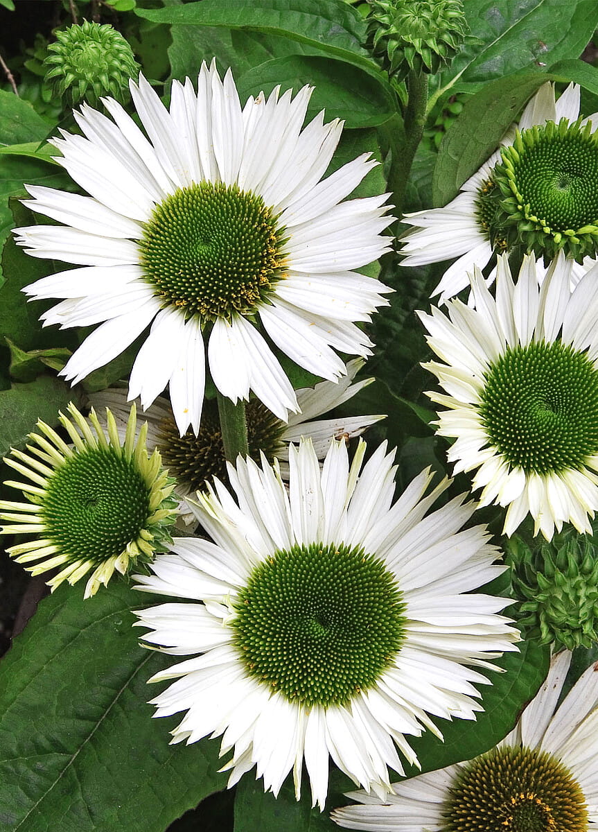 - Kolor kwiatów: śnieżnobiały, półpełny koszyczek z kontrastującym zielono-żółtym środkiem (efekt klasycznej białej jeżówki)