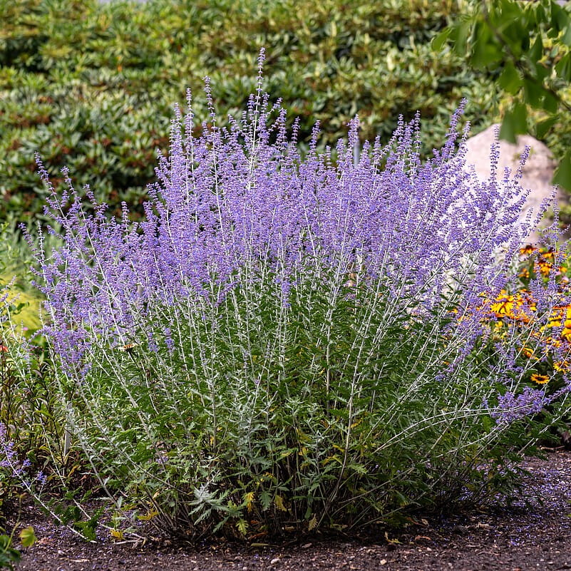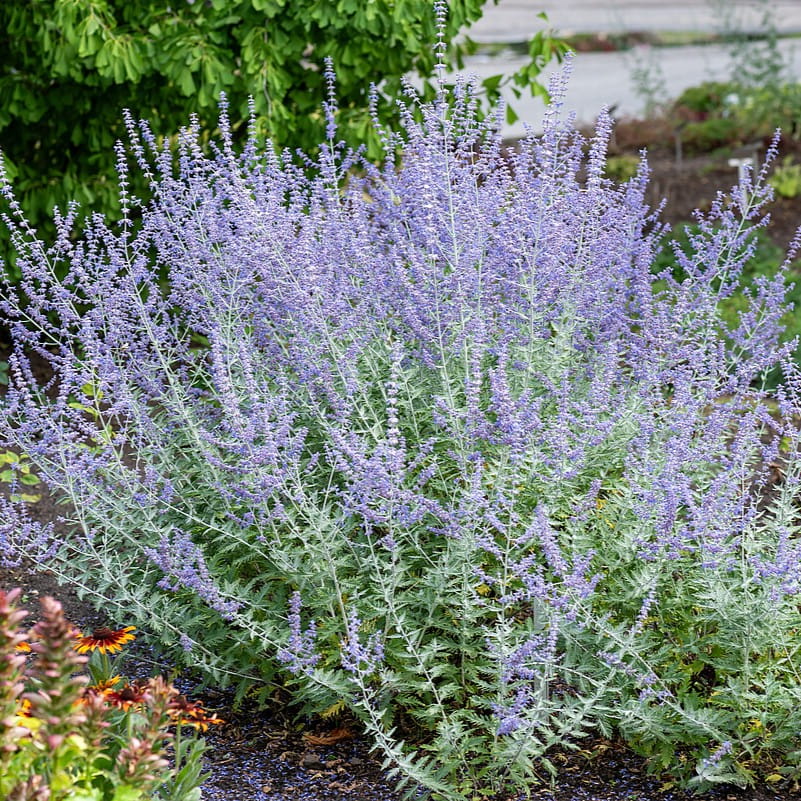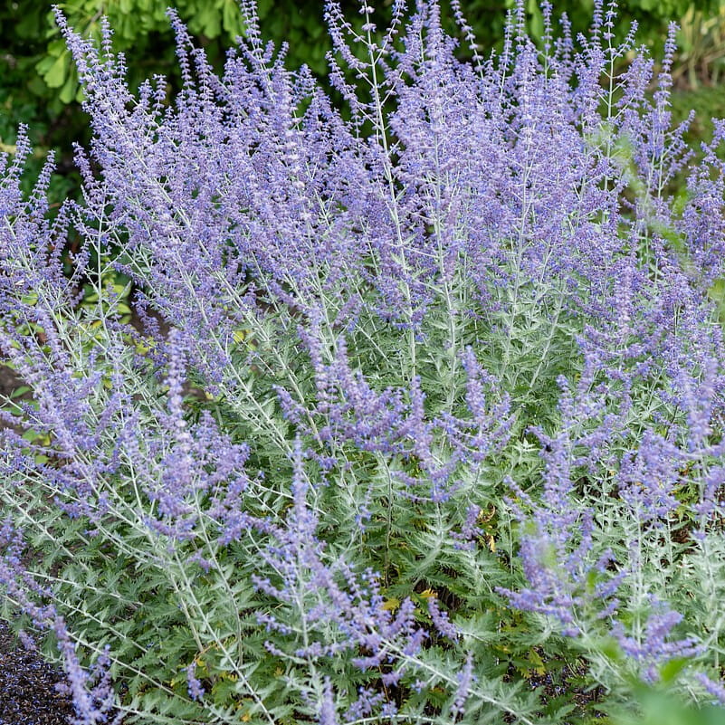 Perovskia atriplicifolia ‘Russian Sage’ to klasyczna, wysoka forma perowskii, często spotykana w sprzedaży pod nazwą handlową, a nie jako konkretna odmiana hodowlana. Charakteryzuje się luźnym, naturalnym pokrojem, srebrzystym ulistnieniem oraz długim, obfitym kwitnieniem w odcieniach błękitu i fioletu.